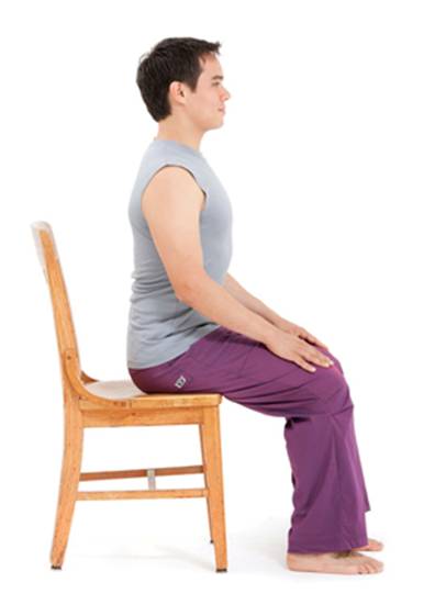 In this well-aligned sitting posture, the head is balanced directly over the shoulder girdle, relieving supporting muscles of the extra burden of holding it up against gravity. Sit tall, with your feet planted firmly on the ground and your sit bones dropping down into the seat of the chair. From this place of grounding, extend the crown of your head up toward the sky, lengthening your spine. Soften your shoulders away from your ears and rest your hands on your thighs. Be sure your chin is parallel to the ground, neither poking up nor tucked in. Imagine that you have a headlight in the center of your chest at your sternum, and shine that light directly forward. Relax your face. With a soft gaze and smiling eyes, look toward the horizon. You might visualize yourself resting your head back against a supportive headrest. If someone looked at you from the side, they’d see your ear directly over your shoulder, and your shoulder directly over your hip.