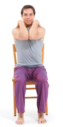 Angel Wings with Circles Geared toward enhancing circulation in the shoulders and upper back, this posture helps free the scapulae, which are suspended by a network of muscles and ligaments that attach to the neck and upper spine. From seated mountain pose, extend your arms forward; then bend your elbows and place your fingertips on your shoulders. On an inhalation, open your elbows out to the sides as you draw your shoulder blades together in the back of your body; imagine that you have a nut on your spine and your shoulder blades are moving together like a nutcracker to squeeze it. On an exhalation, bring your elbows forward and together, as you feel your shoulder blades sliding apart in back of your body. Continue for 3 to 6 breaths. Then, keeping your fingers resting lightly on your shoulders, imagine that your elbows are felt-tipped markers, and draw large ovals in the air with them. Keep the breath slow and easy as you circle in one direction for 3 to 5 breaths and then reverse direction for 3 to 5 more breaths.